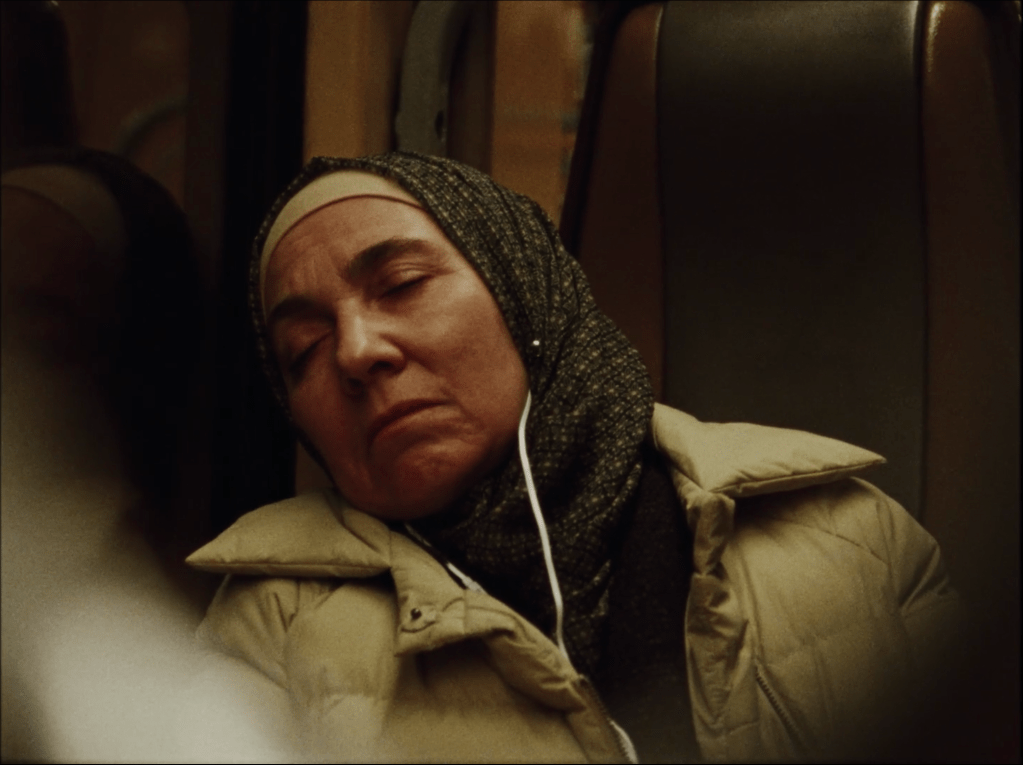 Our protagonist is a Muslim woman named Khadija (Saaida Bentaïeb), who we first meet near the end of a coworker’s story before she and a whole room of people burst out laughing. She laughs the longest, and fails to control herself so infectiously that she gets the whole room going again even after they’ve all died down. Before we see her get her laughter under control, we cut to her working as a cleaner in a large building. It’s night, and when she hops onto the subway to return home the space is nearly deserted. She nestles into her seat, pops in her headphones, and closes her eyes. The shot lasts long enough to lull us into the comfort of this image, to feel what a relief it must be for her to be sitting down and losing herself in music we cannot hear, before cutting to a shot of Khadija alone and outside in her puffy white winter coat, leaving a message for her kid to call her back whenever they can. Khadija fell asleep on the ride home (the last ride of the evening for this line), missing her stop, and now needs to find a new way home.
