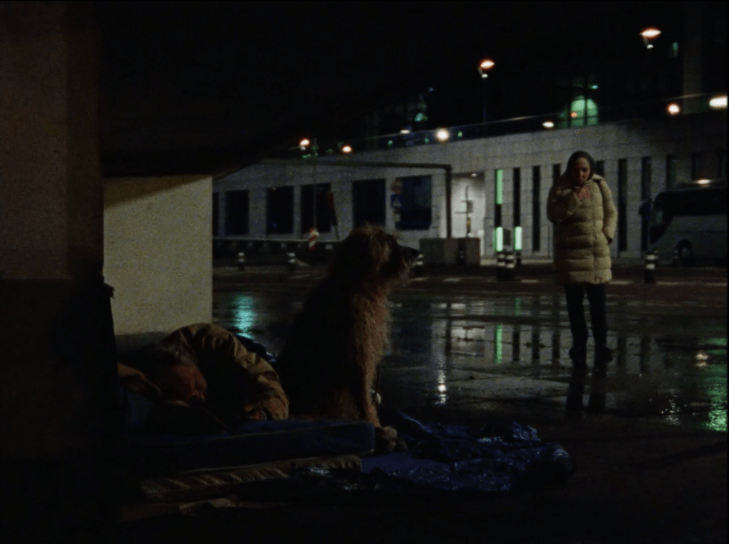 The remainder of Ghost Tropic concerns her efforts to get home, hoofing it on foot, stopping periodically for one reason or another. Here Khadija is asking a security guard locking up a mall to let her in and use an ATM – he obliges, but finds there isn’t enough money for her to call a cab. She thanks him anyways, and as he walks off she expresses a fascination with the berry scent of his vape. Here Khadija is following the guard’s instructions and arriving at a late-night public bus, only for it to be declared out of order a couple seconds after she sits down. Here Khadija is finding a homeless man asleep in the cold, guarded by a small dog, calling an ambulance to take him to the hospital, and wondering what will become of the man’s dog with an EMT as he’s loaded into the vehicle. Her efforts to get home are thwarted, and so she walks, even making detours along the way. For as low-key as the film’s incidents are, I hesitate to call Ghost Tropic a plotless film, since what makes Bas Devos’ directorial hand so intoxicating is his approach to a scenario that you could imagine going differently, largely in less pleasant ways, if handled by other artists. The beauty of it resides in its commitment to depicting Khadija’s story with a real sense of humanism, embellished by a sense of stylization that floats effortlessly between grounded realism, subjective point-of-view, and experimental colors and tones. It’s like the outdoor passages of Jeanne Dielman have been stitched and stretched into their own feature, albeit laced with something much warmer at its center.